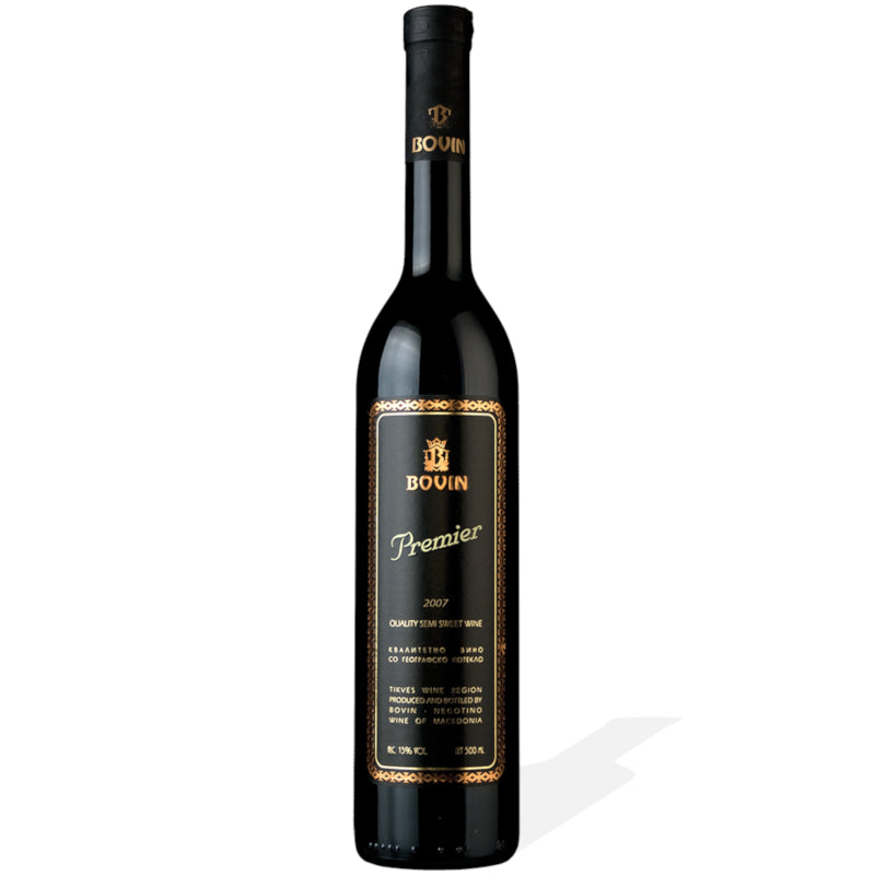 - Premier is a unique semi-sweet wine made from the Cabernet Sauvignon variety and can only be tried at Bovina. It is obtained from grapes grown in ecologically clean areas without supplementary irrigation and harvested in an extremely late harvest. Because of this, the yields are extremely low (2400 kg per hectare) and due to the high stage of ripeness of the grapes (28% sugar), the presence of alcohol and dry extract in the wine increases. It has a very black color and a distinctly floral aroma reminiscent of raisins and honey. The full and rich flavors of this special wine resemble nectar and its special fruity flavors linger in the mouth for a long, long time. Premier is served at 10-12ºC and can be a dessert by itself or as an addition to cakes or delicatessen cakes.